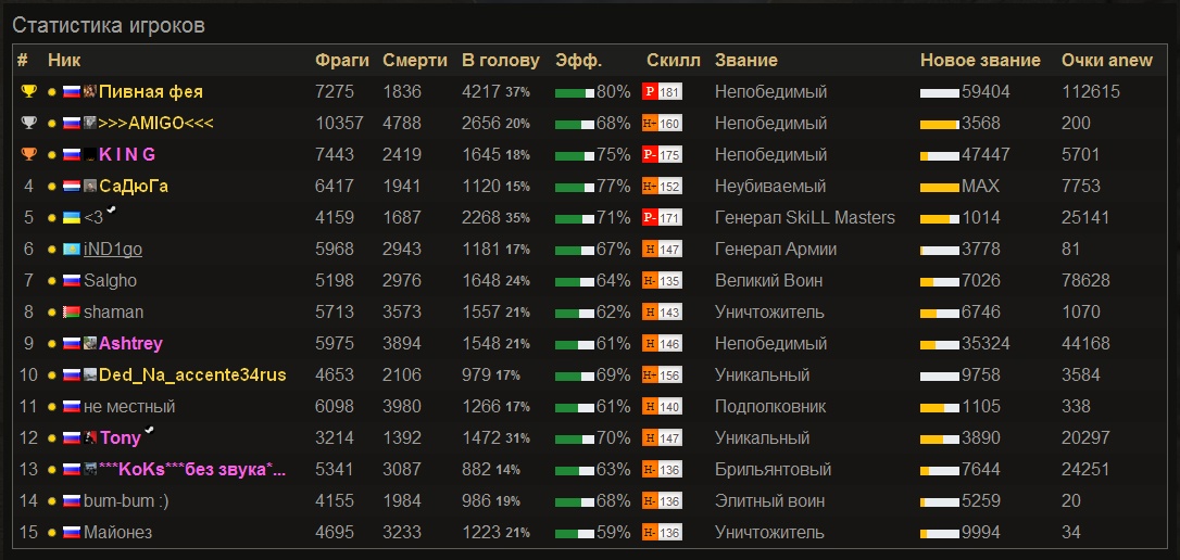 /stats - статистика, играющих в данный момент на сервере игроков (можно посмотреть статистику за карту или общую статистику)