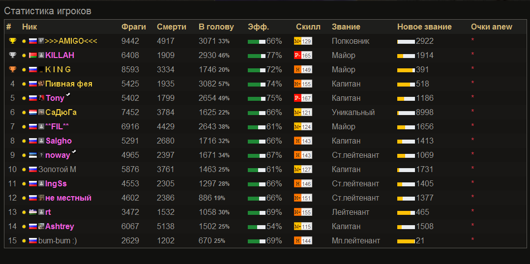 Чтобы посмотреть статистику на сервере нажмите N 7 или напишите в чате /top (/top15, /top30, /top45 и далее)